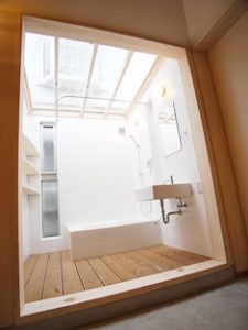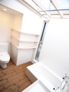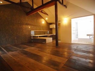 古材を使用した床材やあらわし梁の天井とシンプルモダンな水周りが